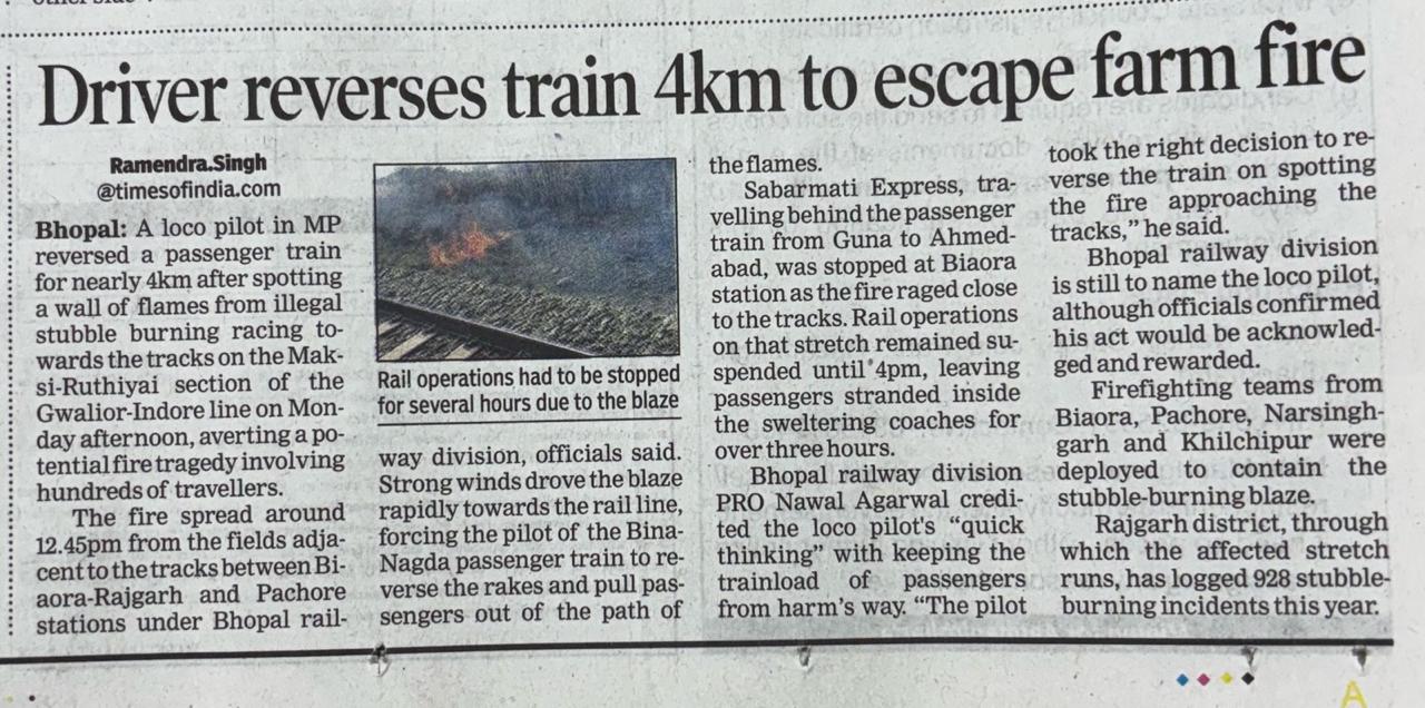 On Monday afternoon, the Bina-Nagda passenger train was cruising along the Maksi-Ruthiyai section. Suddenly, the Loco Pilot was confronted with every driver’s nightmare: a massive wall of fire. Illegal stubble burning in adjacent farm fields, fueled by strong winds, had created an inferno racing toward the tracks.